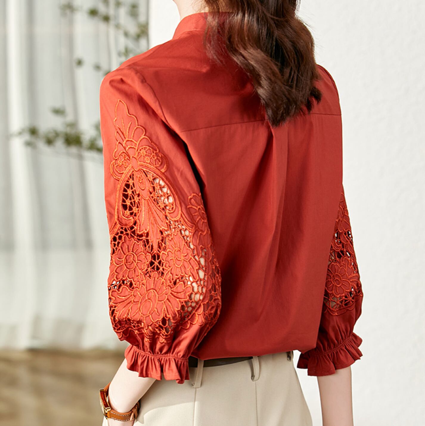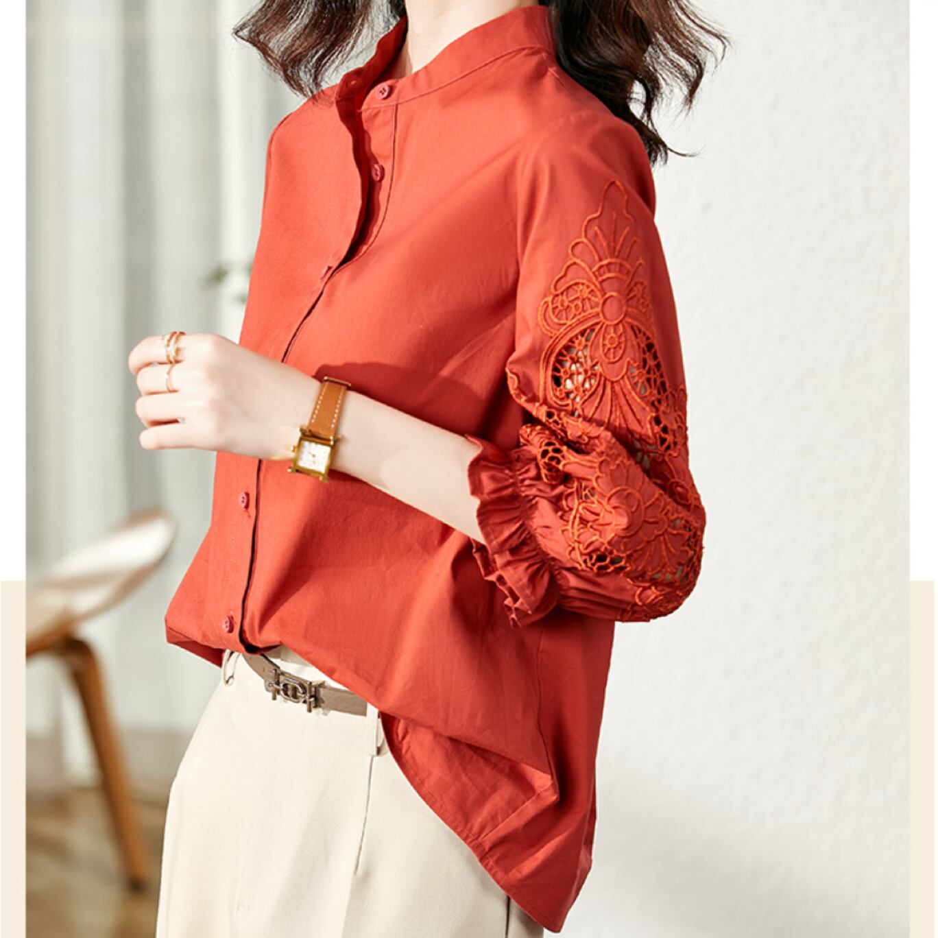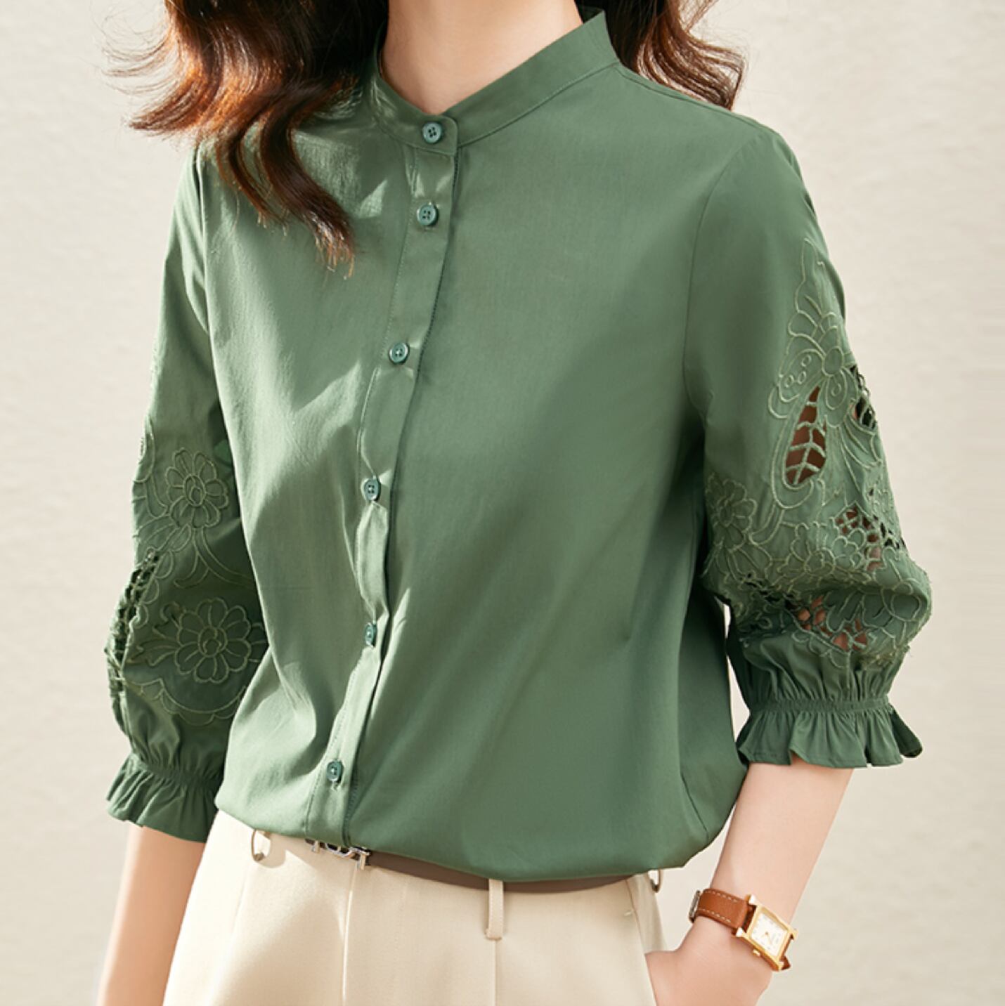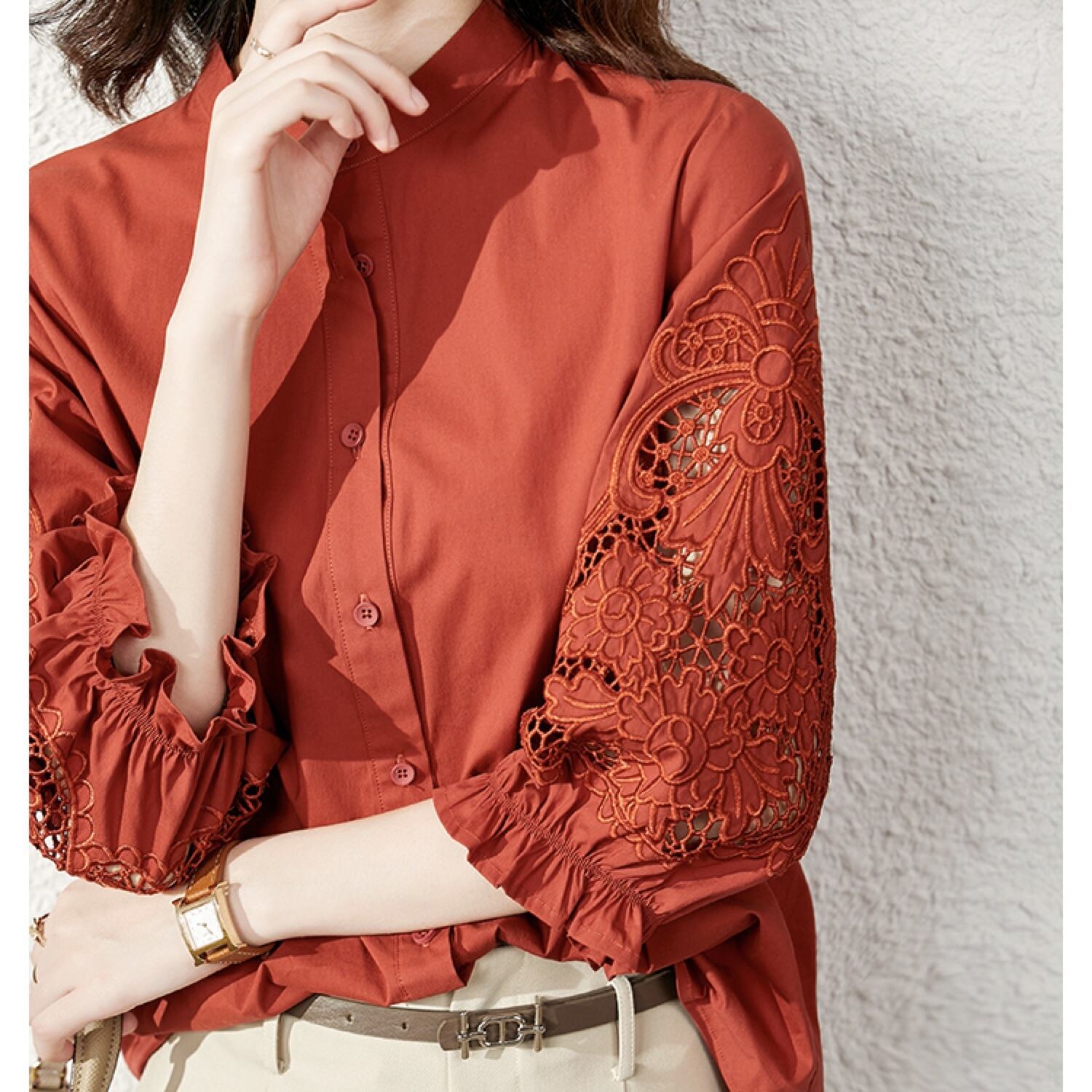 バンド衿のシャツブラウスは堅苦しさを抑えた抜け感と上品さを兼ね備えます。